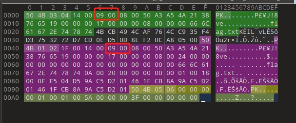 如果压缩文件是加密的,或者文件头正常但是压缩错误,首先尝试问就按是否是伪加密。zip文件是否是加密,是通过标识符来显示的,在每个文件的文件目录字段有一位专门标识了文件是否加密,将其实设置为00表示该文件未加密,如果成功解压则文件为伪加密,如果解压出错说明文件为真加密,这时候就需要根据线索,或者使用工具来破解密码.